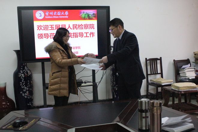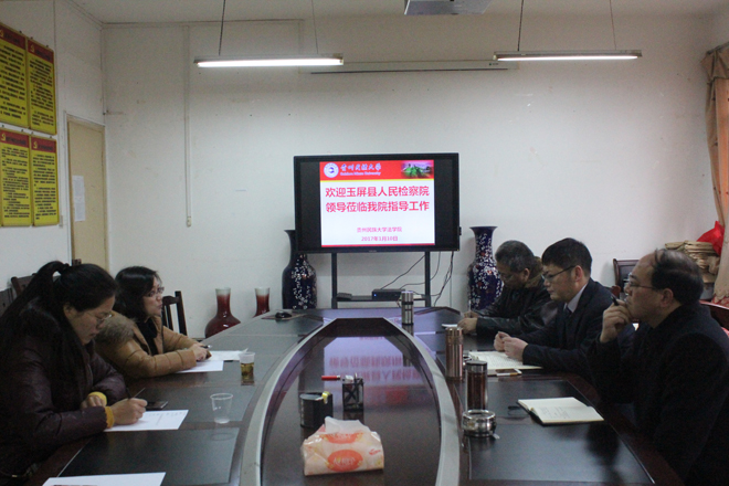 2017年1月10日下午,我院在二楼会议室召开与玉屏县人民检察院“教学实习基地”协议签约座谈会。玉屏县人民检察院政工科科长黄亚琼、我院党委书记盘淼教授、院长宋强教授、副院长张帆教授出席,会议由宋强院长主持。